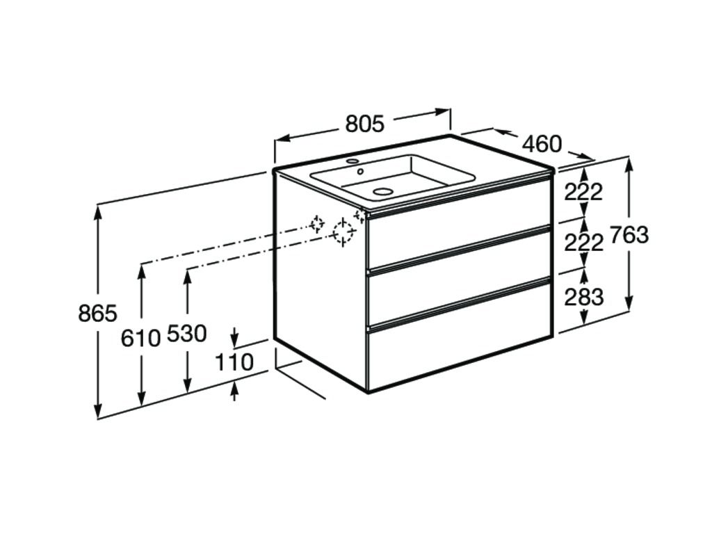 | Description | Base unit / Door type: Sliding Base unit / Doors and drawers combination: 3 drawers Base unit / Internal dividers Base unit / Structure: Drawers Basin / Integrated shelf Basin / Shelf position: Left Basin / Taphole configuration: 1 taphole in the middle Basin Position: Left Dimensions / Basin and base unit / Height (mm): 763 Dimensions / Basin and base unit / Length (mm): 805 Dimensions / Basin and base unit / Width (mm): 460 Installation type: Wall-hung, Wall-hung with optional legs Material / Base unit: Chipboard Material / Basin: Vitreous china Publication Status Tap installation: On the basin |