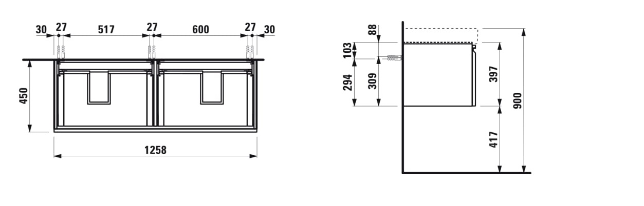 | Description | Adjustable legs Basin position: Left, Right Basin type: Vanity Doors and drawers combination: 2 drawers Furniture configuration: Drawers Installation type: Wall-hung Internal dividers Internal drawers: 0 Internal shelves: 0 Legs included: 0 |